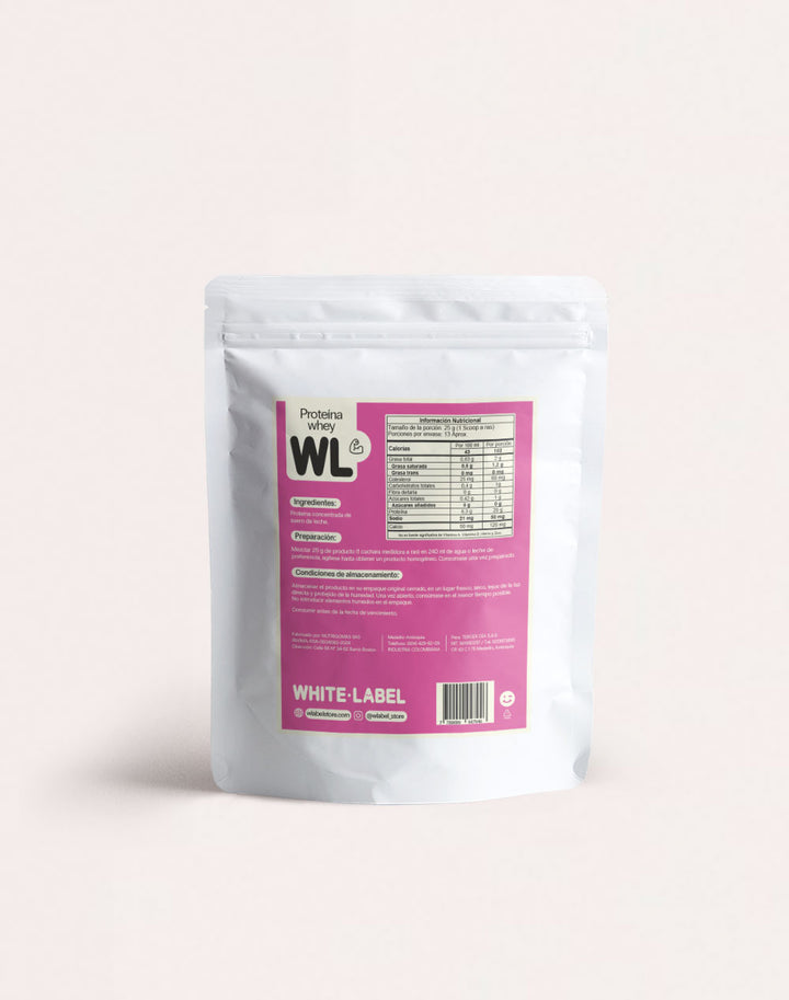La proteína whey de White Label, contiene 20 g de proteína por porción y 0 g de azúcar añadido